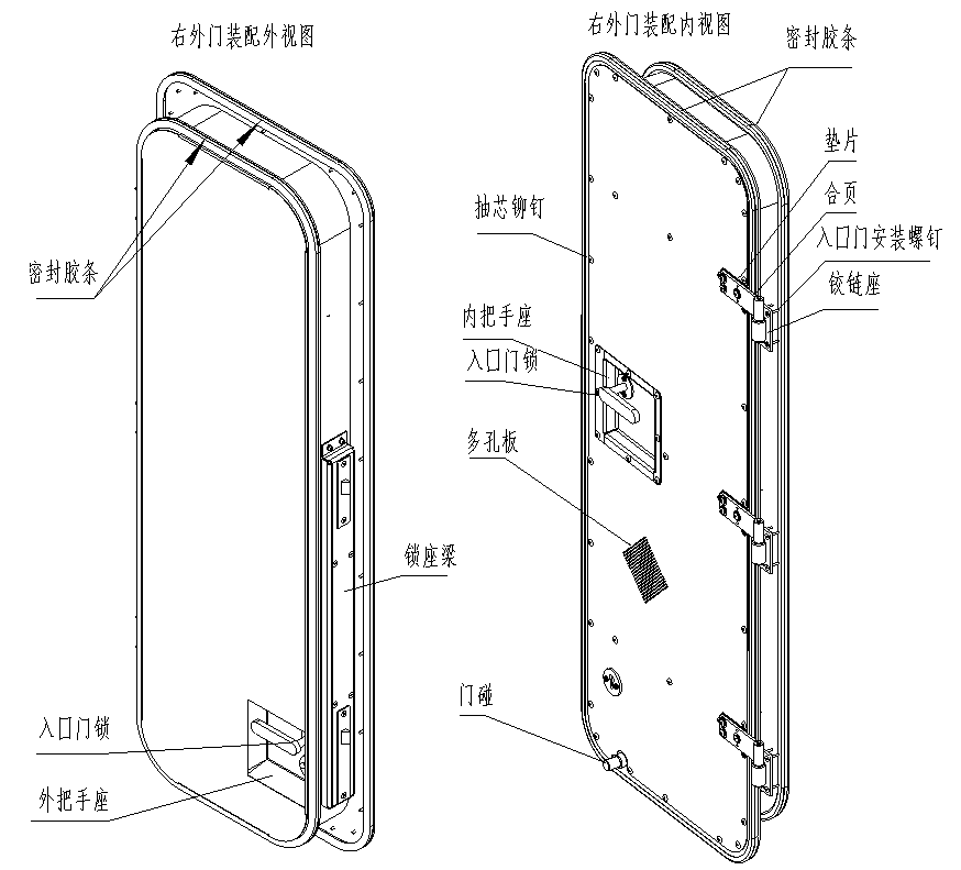 入口門分左、右入口門,左、右入口門以鏡像對稱方式安裝在HXD2C機(jī)車司機(jī)室左、右側(cè)墻上,完整的入口門包括鎖緊系統(tǒng)、門扇框架、密封系統(tǒng)、活頁及鉸鏈座等。入口門能承受風(fēng)、沙、雨、雪、煤塵和偶有沙塵暴,并能保持良好的水密性、隔熱降噪性能。